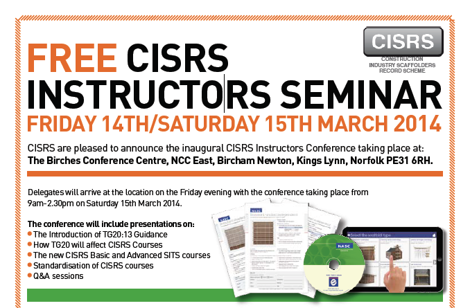 CISRS are in the process of revising the Scaffold Inspection Training Scheme (SITS) – in view of the imminent publication of the NASC’s TG20:13 Technical Guidance for tube and fitting scaffolding (TG20). Read more by clicking link above.
